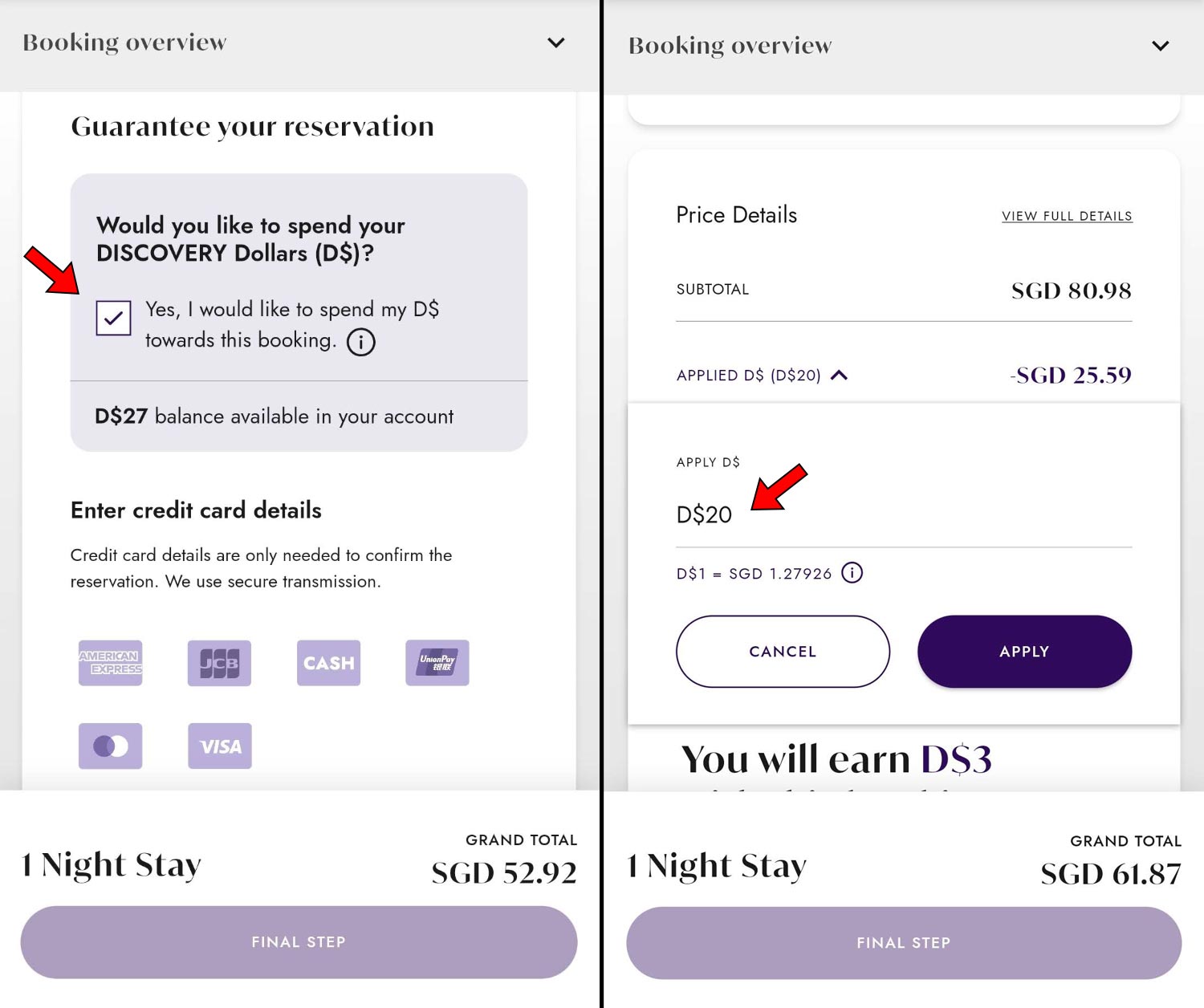 Since the program refresh back in 2021, redeeming Discovery Dollars (D$) hasn’t been an entirely smooth experience. Members could only make a redemption in-person, upon check out. In my experience, this often lead to delays in the check out process, and I had to actively remind the front desk to process it before my time to leave.